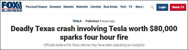 美國一輛特斯拉撞樹起火致兩人死亡,“無人駕駛”惹禍?