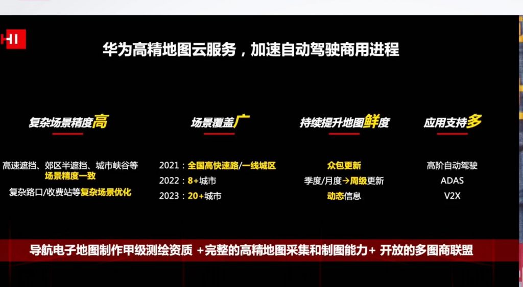 按照華為的時間表,高精地圖在2021年將覆蓋全國的高快速路以及一線城市的城區,到2023年將支持20多個城市。