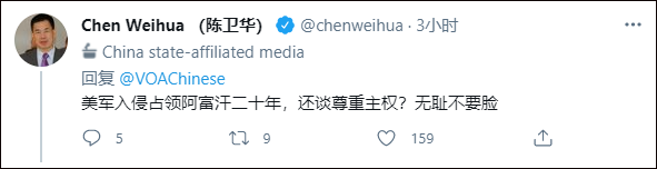 《中國日報》歐盟分社社長陳衞華感嘆:“美軍入侵佔領阿富汗二十年,還談尊重主權?無恥不要臉。”