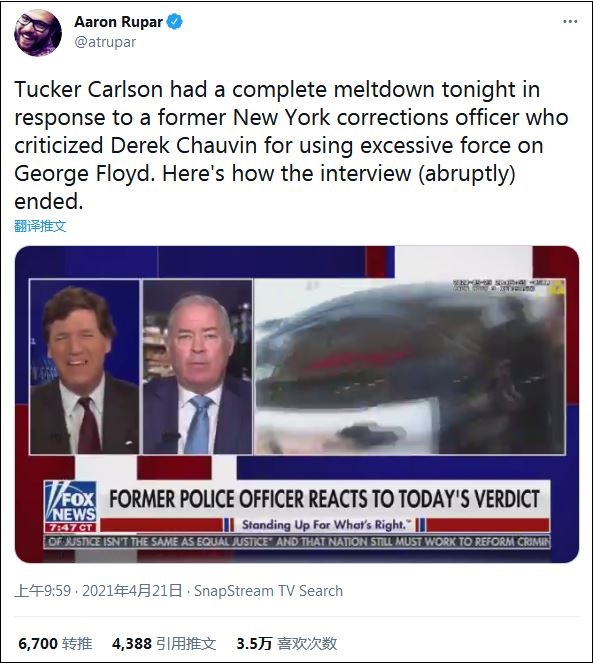 當地時間4月20日,全美矚目的警察德里克·肖萬跪殺非洲裔男子喬治·弗洛伊德裁決一案晚上,卡爾森討論案件時突然狂笑一幕,以及他屢屢因觀點不同,就粗暴打斷嘉賓的表現,在社交媒體上引起軒然大波,短時間內衝上推特熱搜。