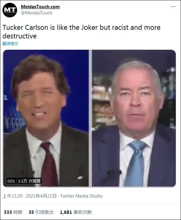 這則動圖的左邊,是福克斯電視台的主持人,特朗普的支持者塔克·卡爾森。動圖的右邊,是DC漫畫的知名角色,“超級惡棍”小丑(Joker)。