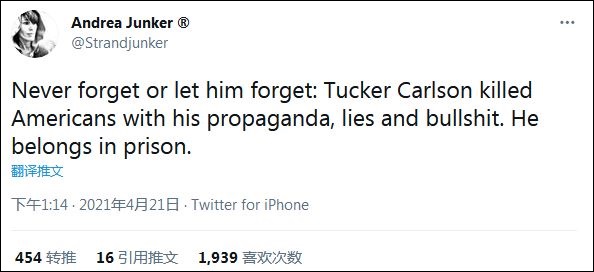 “請不要忘記,也不要讓他忘記:塔克·卡爾森用他的政治宣傳、謊言和廢話殺害了美國人。他應該進監獄。”