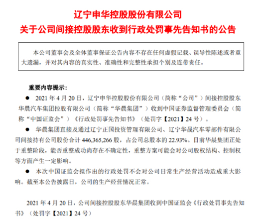 4月20日晚間,金盃汽車和申華控股發佈公告稱,公司間接控股股東華晨集團收到中國證監會《行政處罰事先告知書》,因華晨集團披露的2017年、2018年年度報告涉嫌存在虛假記載等問題,被合計處以5360萬元罰款,被責令改正並給予警告。