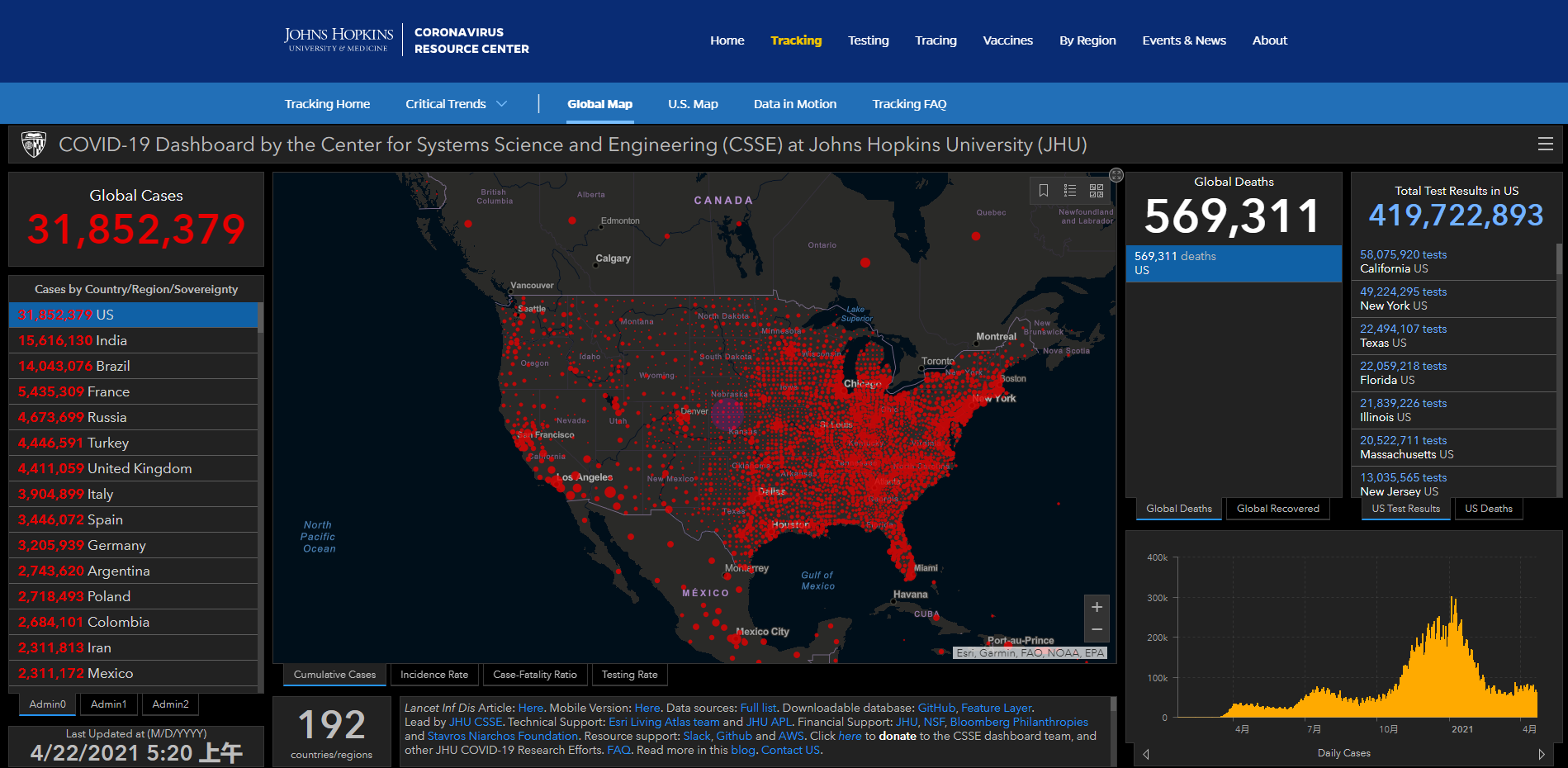 (觀察者網訊)根據美國約翰斯·霍普金斯大學統計數據,截至北京時間2021年4月22日5時20分,美國新冠肺炎累計確診病例31852379例,累計死亡病例569311例。在過去約24小時裏,美國新增確診病例73137例,新增死亡病例1027例。