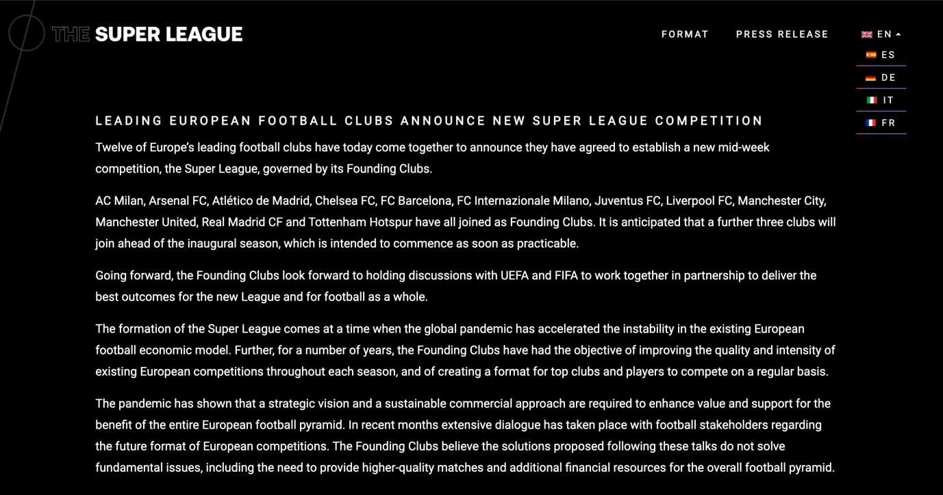 歐洲“超級聯賽”官網發佈的成立聲明,來源:The Super League