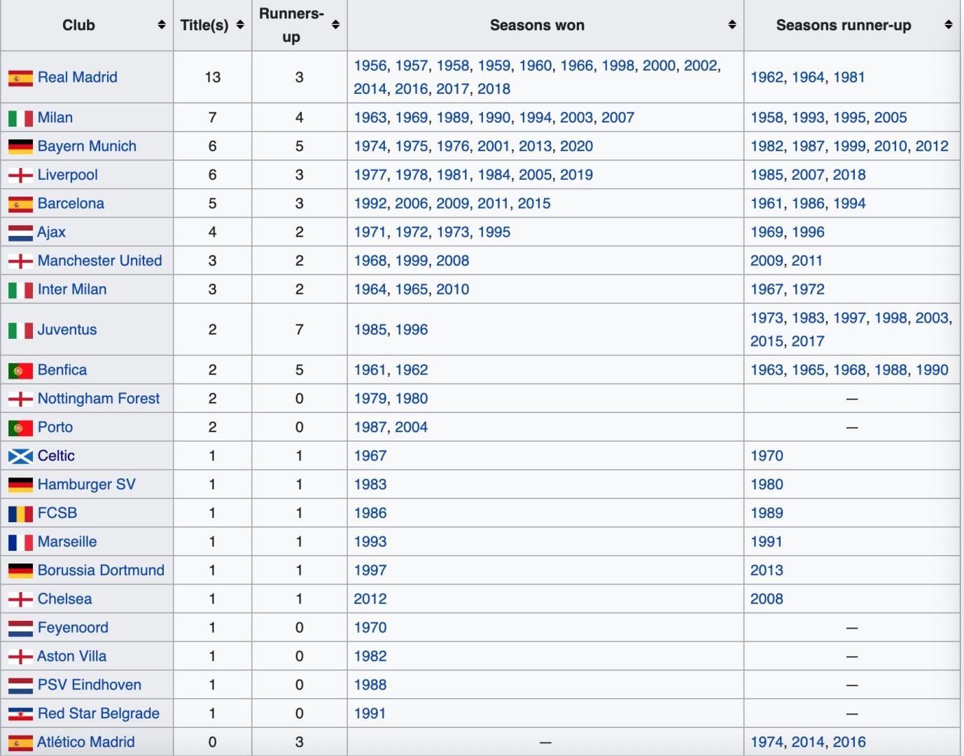 歐冠歷史上22支奪冠球隊中,有8支參與了此次“超級足球”計劃,來源:Wikipedia