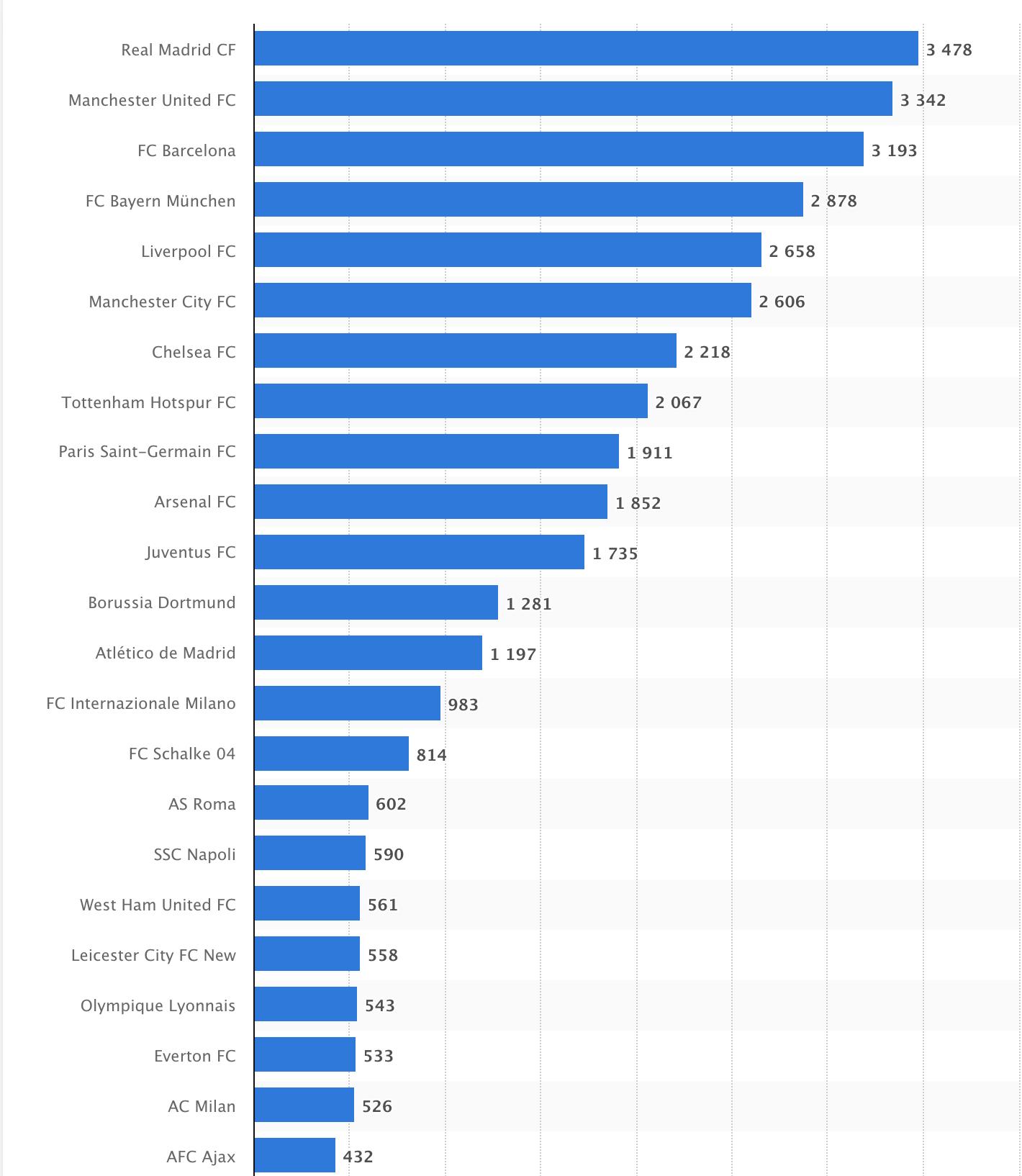 2020年歐洲足球俱樂部企業價值排行榜(單位:百萬歐元),來源:Statista