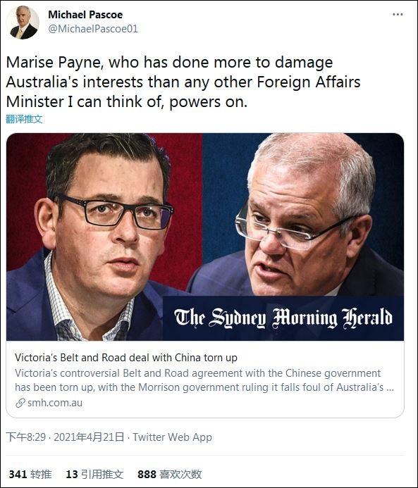 本次會面的另一主角澳外長佩恩,剛剛於21日悍然宣佈,撕毀維多利亞州的“一帶一路”的協議。她的這一舉措,也引發了不小爭議。