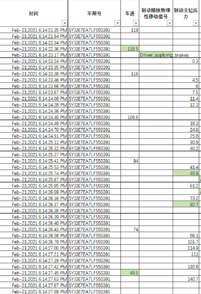 在駕駛員最後一次踩下制動踏板時,數據顯示,車輛時速為118.5千米每小時。在駕駛員踩下制動踏板後的2.7秒內,最大制動主缸壓力僅為45.9bar,之後駕駛員加大踩下制動踏板的幅度,制動主缸壓力達到了92.7bar,緊接着前撞預警及自動緊急制動功能啓動(最大制動主缸壓力達到了140.7bar)併發揮了作用,減輕了碰撞的幅度,ABS作用之後的1.8秒,系統記錄了碰撞的發生。駕駛員踩下制動踏板後,車速持續降低,發生碰撞前,車速降低至48.5千米每小時。