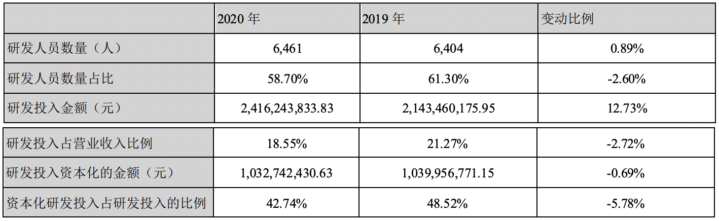 其中,研發投入資本化率為42.74%,較2019年的48.52%下降5.78個百分點。從絕對金額看,研發投入增加超2.7億元的同時,資本化的金額反而下降721萬元。
