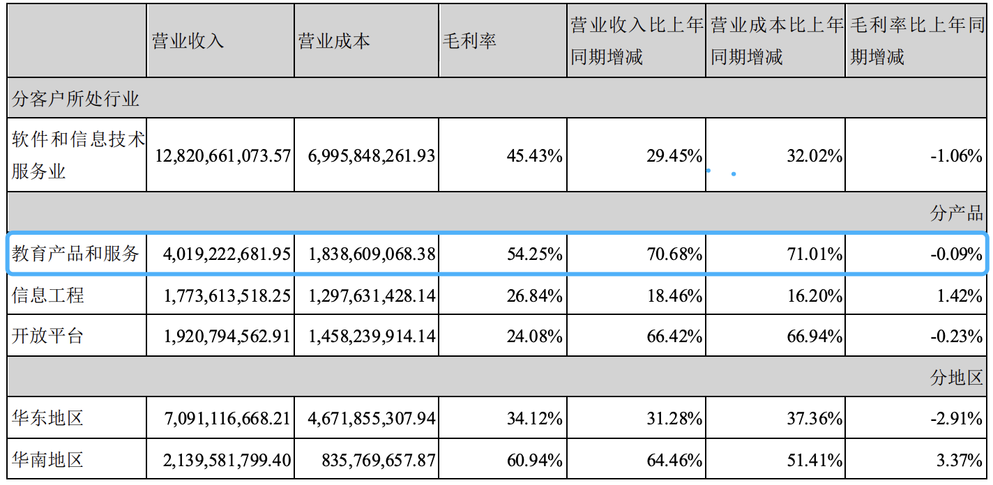 2020年,科大訊飛教育產品和服務實現營收40.19億元,同比增長70.68%;毛利率54.25%,微降0.09個百分點。