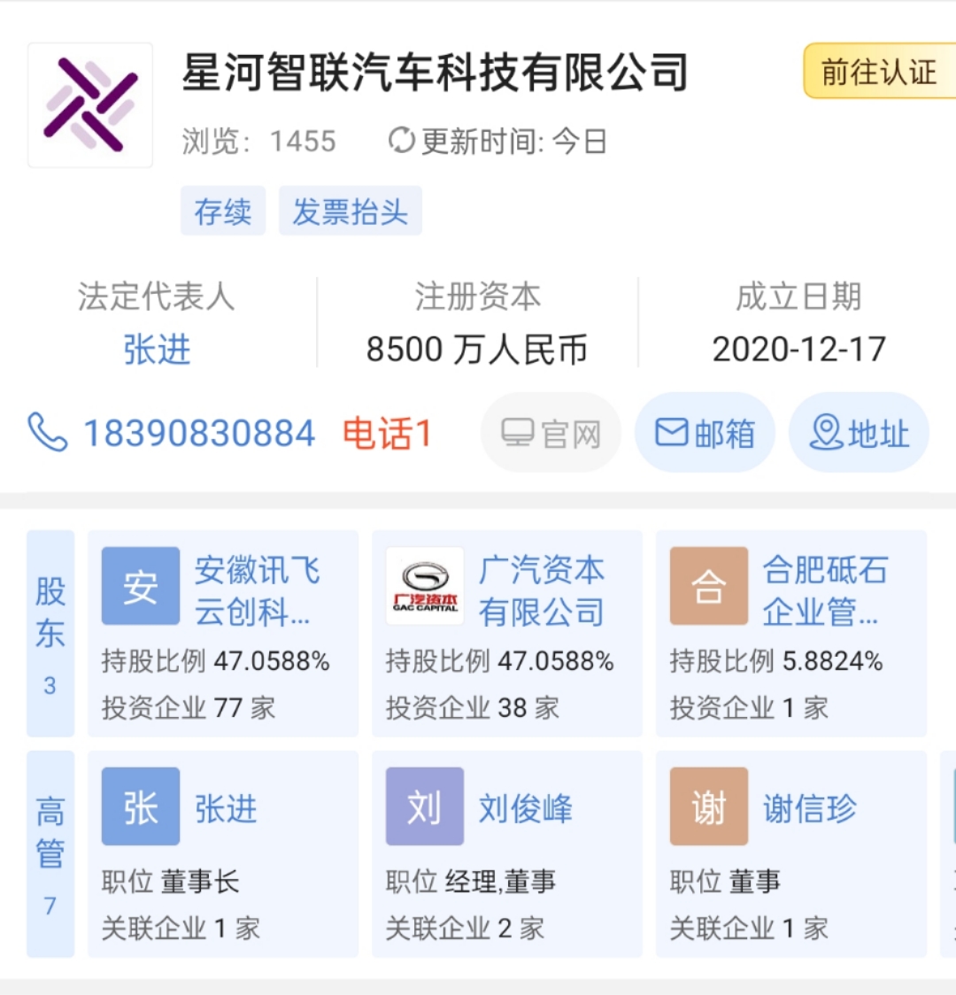 啓信寶APP顯示,這家名為星河智聯汽車科技有限公司,經營範圍包括人工智能基礎軟件、應用軟件開發、汽車零部件研發、智能機器人研發、智能車載設備銷售等。