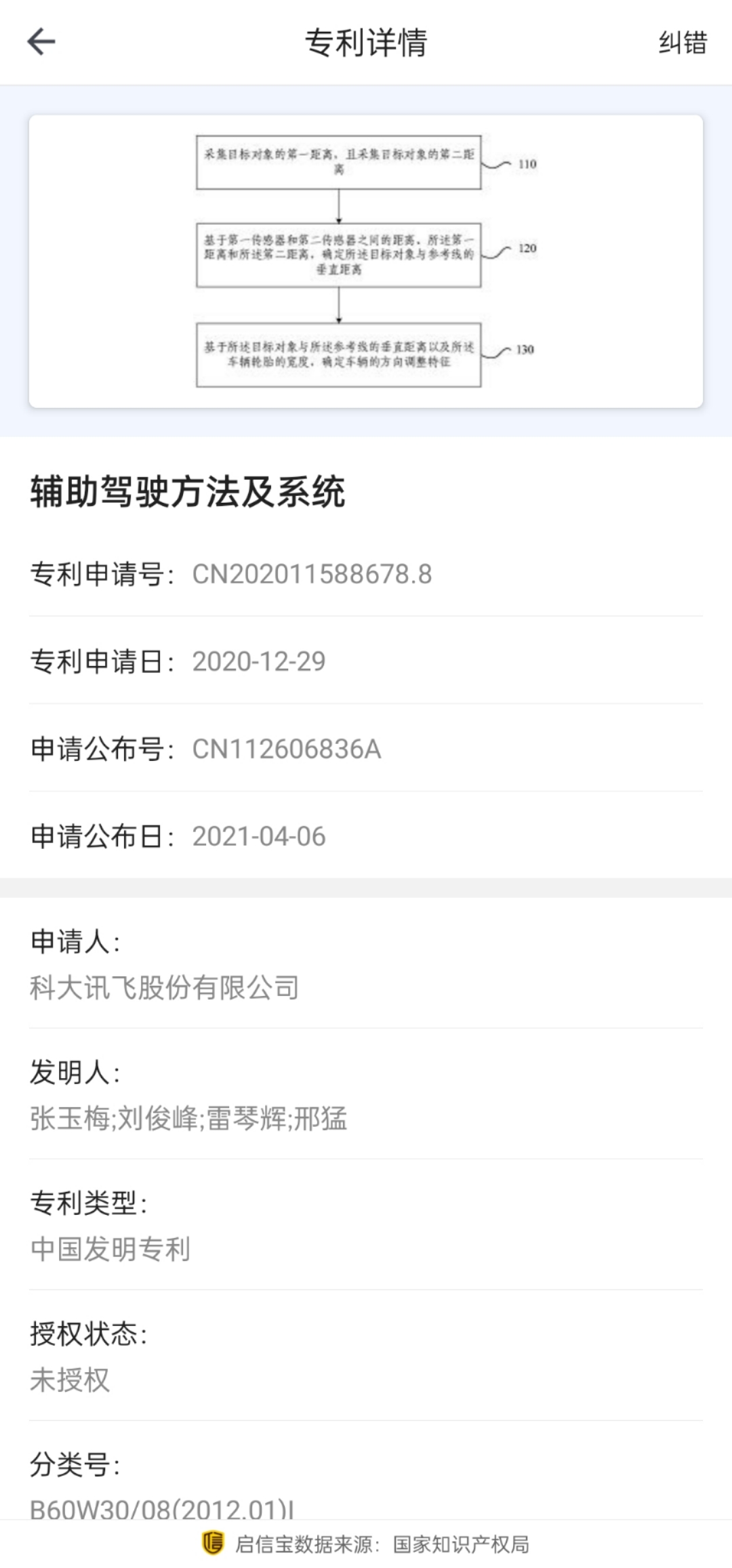 觀察者網在啓信寶APP上查詢到,4月6日,科大訊飛公開一項名為“輔助駕駛方法及系統”的發明專利。據介紹,該專利通過兩個傳感器對目標對象進行測距,能夠實現對小型障礙物定位檢測,進行合理避障。