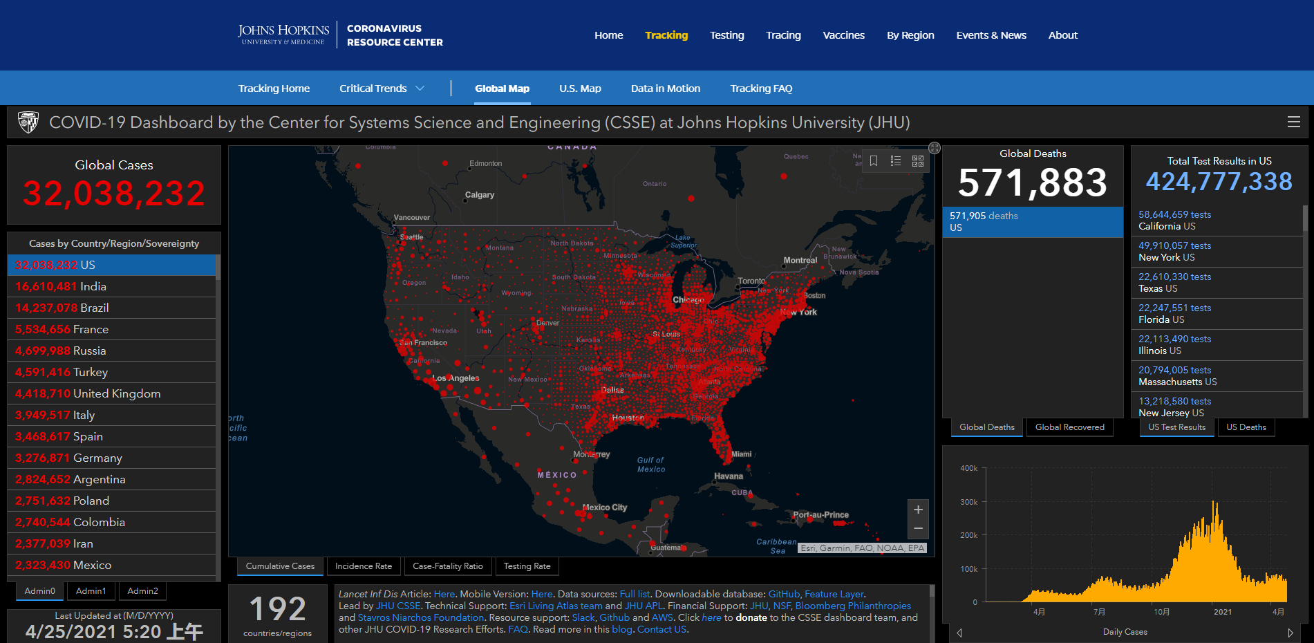 (觀察者網訊)根據美國約翰斯·霍普金斯大學統計數據,截至北京時間2021年4月25日5時20分,美國新冠肺炎累計確診病例32038232例,累計死亡病例571883例。在過去約23小時裏,美國新增確診病例53227例,新增死亡病例792例。