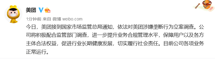 @美團 4月26日發文稱:今日,美團接到國家市場監管總局通知,依法對美團涉嫌壟斷行為立案調查。公司將積極配合監管部門調查,進一步提升業務合規管理水平,保障用户以及各方主體合法權益,促進行業長期健康發展,切實履行社會責任。目前公司各項業務正常運行。
