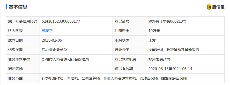 觀察者網查詢啓信寶後發現,鄭州市春霖職業培訓學校成立日期為2015年2月6日,註冊資金10萬元,業務範圍包括計算機操作員、育嬰師、公共營養師、企業人力資源管理師、心理諮詢師、婚姻家庭諮詢師,主管單位是鄭州市人力資源和社會保障局,法人代表是郭花平。