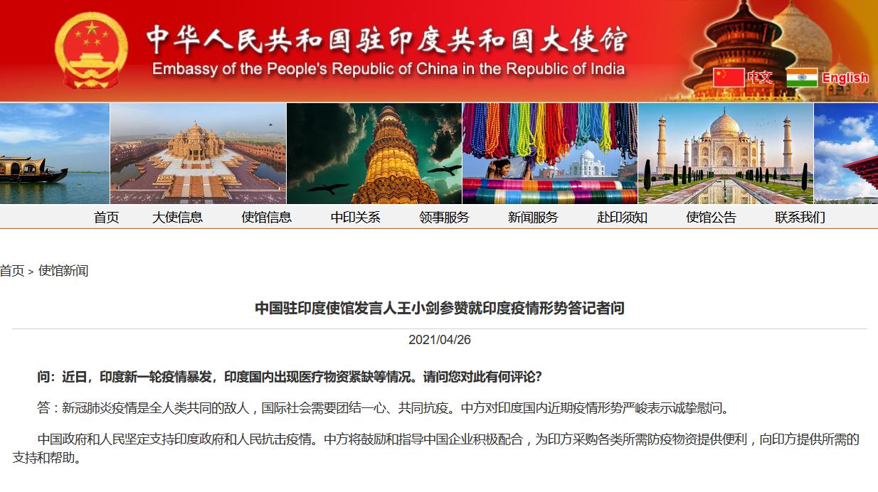 據中國駐印度大使館網站4月26日消息,中國駐印度使館發言人王小劍參贊就印度疫情形勢答記者問。