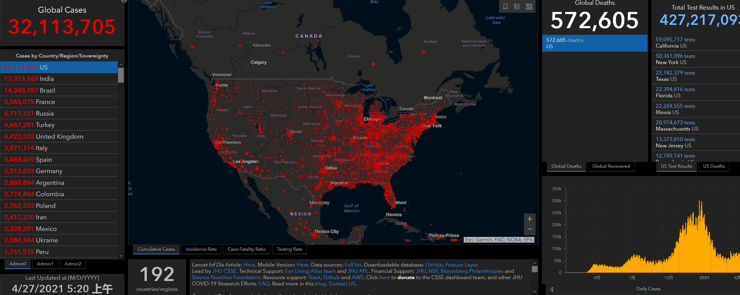 (觀察者網訊)根據美國約翰斯·霍普金斯大學統計數據,截至北京時間2021年4月27日5時20分,美國新冠肺炎累計確診病例32113705例,累計死亡病例572605例。在過去約24小時裏,美國新增確診病例40282例,新增死亡病例413例。