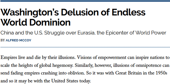 美國威斯康星大學麥迪遜分校歷史系教授阿爾弗雷德·麥考伊(Alfred W.McCoy)2021年3月21日在美國TomDispatch網站發表了評論文章:《以為自己可以永遠主導世界是華盛頓的妄想——中美兩國就亞歐大陸這個世界權力中心所展開的博弈》