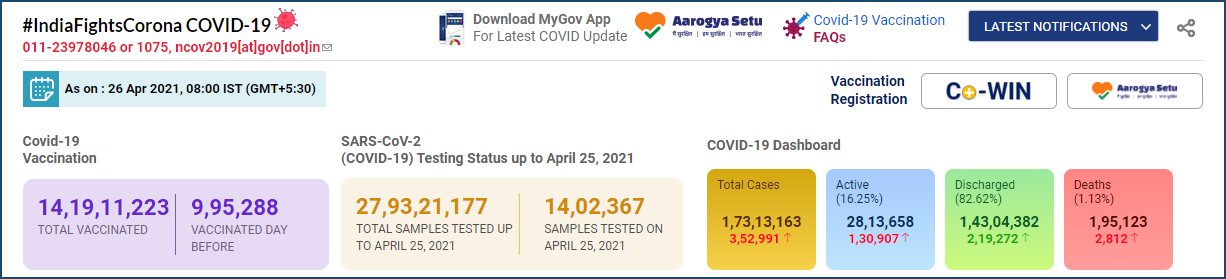 過去24小時,印度新增確診35萬例,新增死亡2812例 (截自印度政府疫情數據官網)
