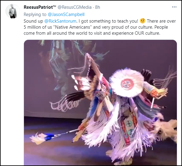 “當然,這裏有原住民,”桑托勒姆承認,“但是説老實話,現在美國的文化裏沒有多少原住民文化。”