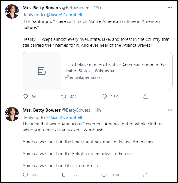 推特上,有網友為了反駁桑托勒姆,拿出一份清單證明,美國現在許多河湖森林,還有州名,仍在使用印第安語命名。