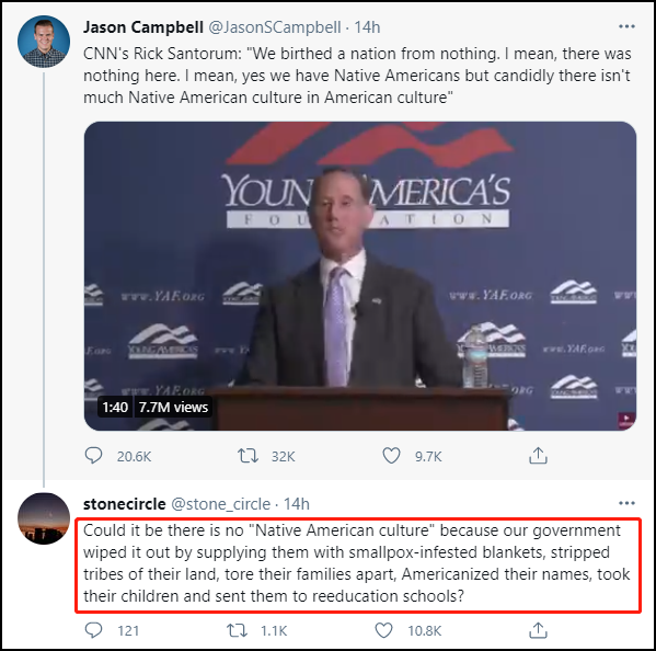 美國有線電視新聞網(CNN)政治評論員,前參議員裏克·桑托勒姆(Rick Santorum)4月23日在保守派團體活動上的一番言論被批“白人至上主義”,引發了多方強烈不滿。美國印第安人全國代表大會主席夏普在聲明中要求CNN解僱桑托勒姆,“播放他關於原住民種族滅絕(genocide)的觀點,等同於把納粹搬上熒幕為大屠殺正名。”