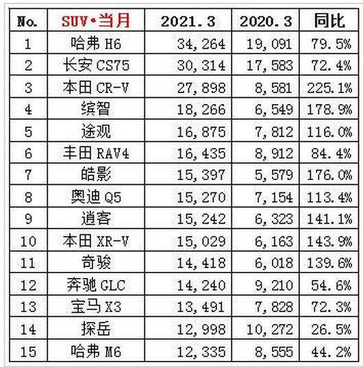 從3月終端零售銷量來看,放眼國內整個SUV市場銷量前15的車型排行榜中,自主品牌僅有3款車型上榜,分別是哈弗H6、長安CS75以及哈弗M6,終端銷量分別為34,264輛、30,314輛及12,335輛,同比增長分別為79.5%、72.4%和44.2%,分別為位列排行榜冠軍、亞軍及第十五名位置。