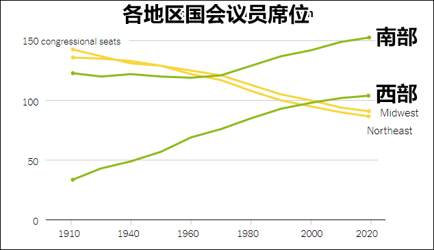 美國南部與西部地區的國會議員席位呈逐年增加趨勢 製圖:《紐約時報》 下同