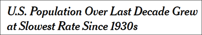 《紐約時報》憂心地注意到,即便是在大蕭條的十年裏,美國人口增速也隨着經濟恢復呈“U”型回升;然而自2008年金融危機以來,美國的人口增速持續降低,未見回升。