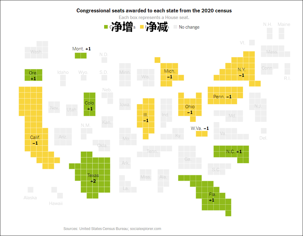 綠色州淨增國會眾議員席位(數字),得州淨增2席;黃色為席位減少的州 製圖:《紐約時報》