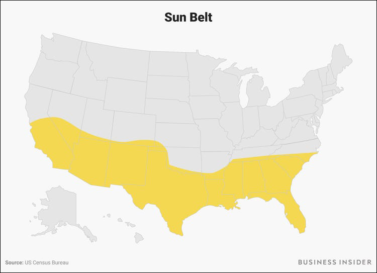 一般認為,“太陽帶”是指北緯36度線以南、氣候温暖的美國南部與西南部地區。上世紀70年代,這些地區加起來佔美國總人口的不到一半;而在本次人口普查中,其佔比已達到62%。