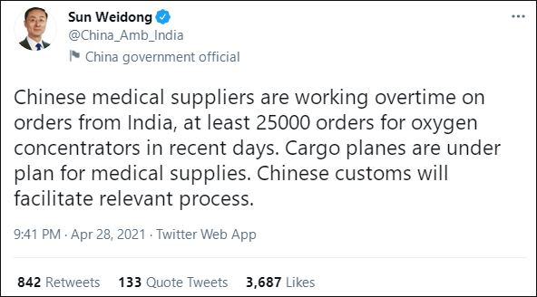 4月26日,中國駐斯里蘭卡大使館推特賬號表示,800台製氧機已被從中國香港空運至德里,本週還將運來10000台。