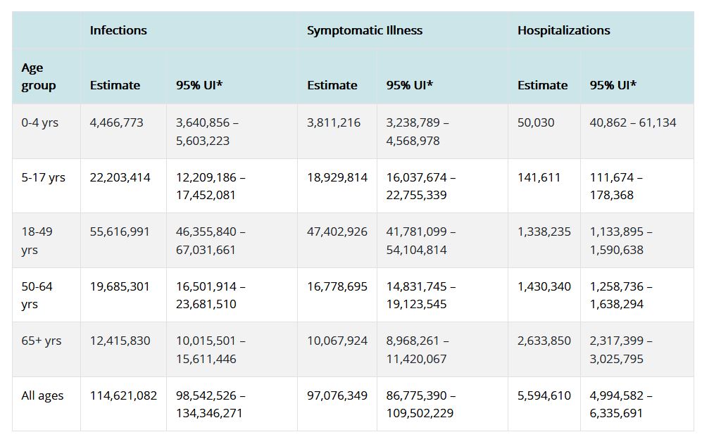 而在去年2月至12月期間,美疾控中心估計,在受感染人羣中,近50%的人年齡在18歲至49歲之間,23%的人年齡在17歲或更小。在住院治療方面,據估計有47%的患者年齡在65歲及以上,只有4%的患者年齡在17歲及以下。統計的不確定性區間(uncertainty interval)為95%。