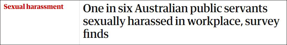 澳大利亞公務系統內的性騷擾問題引人注目。據《衞報》報道,“社區及公共部門聯盟”秘書長梅麗莎·唐娜麗(Melissa Donnelly)表示,“澳大利亞政府、澳大利亞公共服務部門(APS)和有關機構,沒有對性騷擾問題採取任何實質性措施。”