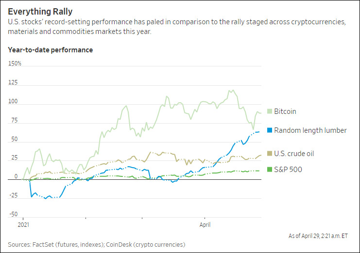 美媒《華爾街日報》4月27日指出,很少有如此多資產同時上漲這麼多的情況出現,這股狂熱蔓延的範圍已遠遠超出華爾街金融機構所追蹤的傳統市場,進而引發人們對全球市場都出現泡沫的新擔憂。