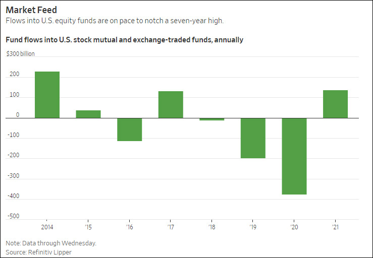 不過,這絲毫沒有減弱他們對股票的熱情。根據數據提供商Refinitiv Lipper的數據,僅在3月份,美國共同基金和ETF就吸引了約980億美元資金流入,為有記錄以來單月之最。自去年12月以來,這些共同基金和ETF已吸引1378億美元資金流入,流入規模有望達到七年來的最高水平。