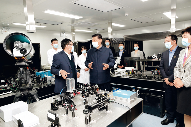 2021年4月19日,在清華大學建校110週年校慶日即將來臨之際,中共中央總書記、國家主席、中央軍委主席習近平來到清華大學考察。這是習近平在清華大學成像與智能技術實驗室同師生們親切交談。 新華社記者 黃敬文/攝