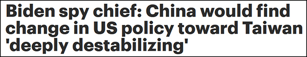 (觀察者網訊)據美國《國會山報》當地時間4月29日報道,美國國家情報總監艾薇兒•海恩斯(Avril Haines)當天宣稱,美國當局認為,中國大陸方面沒有興趣和美國開戰,但若美國決定動用軍事力量插手台海地區的“衝突”,中國大陸將會認為這是嚴重破壞穩定並採取反擊。