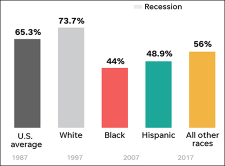 2020年第一季度美國各族裔住房擁有率,紅色代表非裔