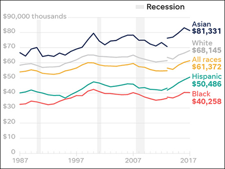 美國各族裔收入中位數隨年份變化曲線,紅色曲線代表非裔,《今日美國報》報道截圖(下同)