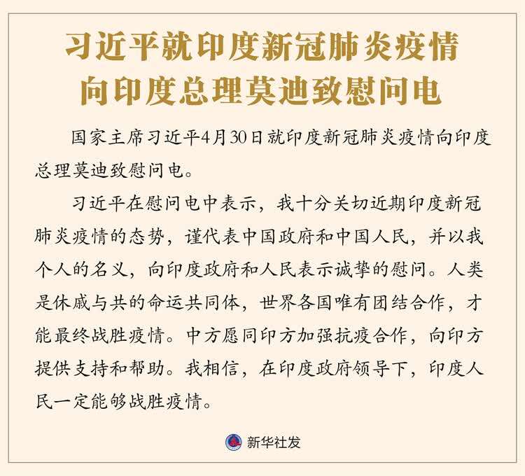 習近平在慰問電中表示,我十分關切近期印度新冠肺炎疫情的態勢,謹代表中國政府和中國人民,並以我個人的名義,向印度政府和人民表示誠摯的慰問。人類是休慼與共的命運共同體,世界各國唯有團結合作,才能最終戰勝疫情。中方願同印方加強抗疫合作,向印方提供支持和幫助。我相信,在印度政府領導下,印度人民一定能夠戰勝疫情。