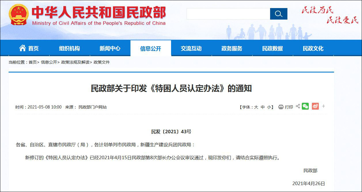 據民政部網站5月8日消息,新修訂的《特困人員認定辦法》已經2021年4月15日民政部第8次部長辦公會議審議通過,自2021年7月1日起施行。2016年10月10日民政部印發的《特困人員認定辦法》同時廢止。