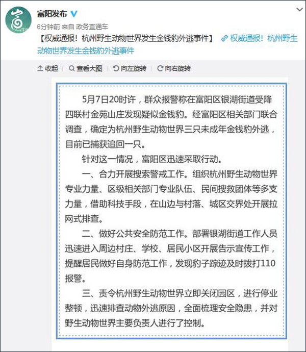 杭州野生動物世界三隻金錢豹外逃,已追回一隻