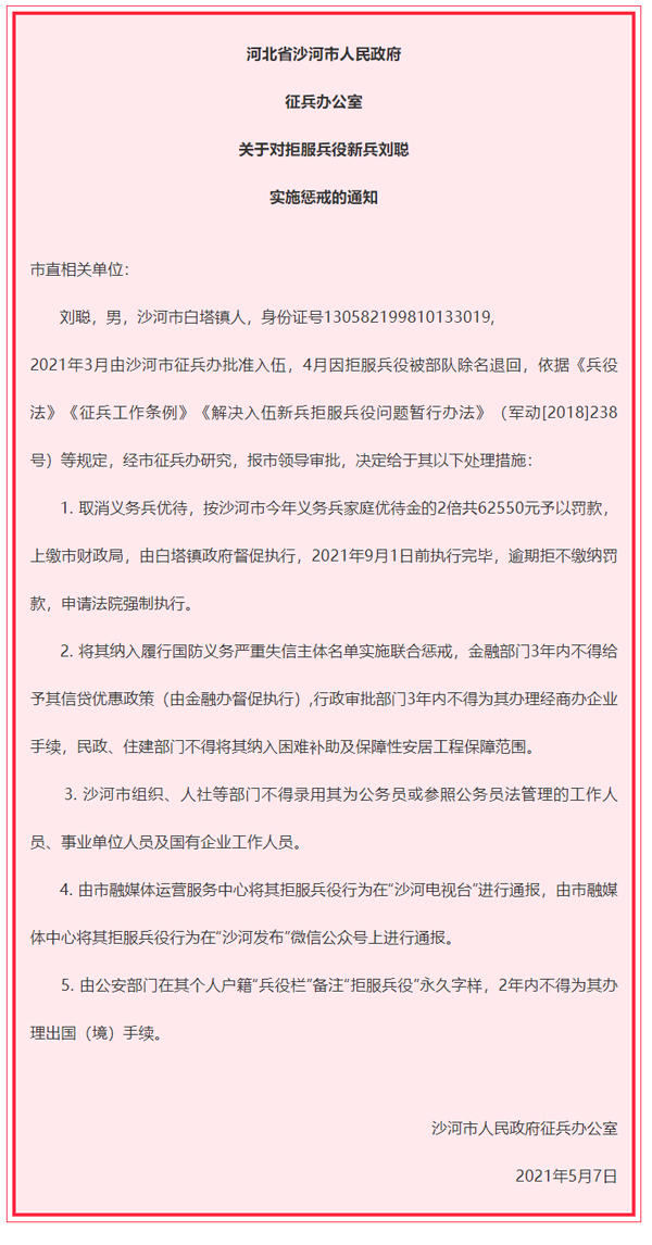 微信公眾號“沙河發佈”5月8日消息,河北省沙河市人民政府徵兵辦公室發佈通知,對拒服兵役新兵劉聰實施懲戒。
