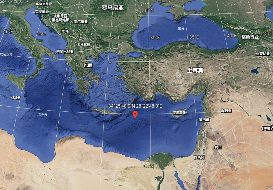 再入區域中心點位於東經28.38°,北緯34.43°,圖為谷歌地球中該位置示意
