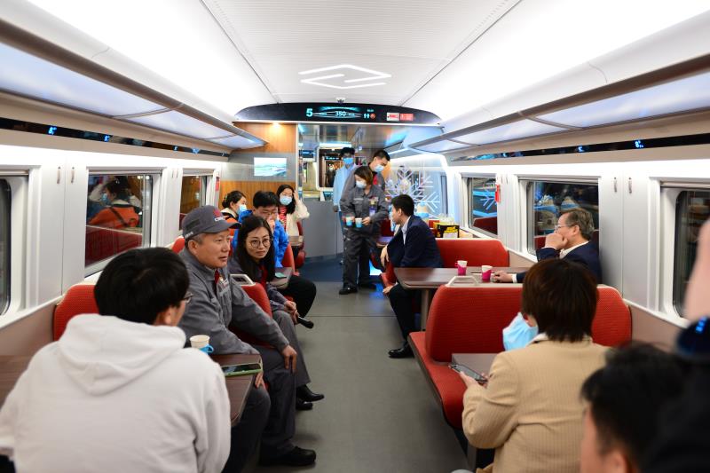 張國芹(左三)和同事、媒體人員在智能動車組車廂裏