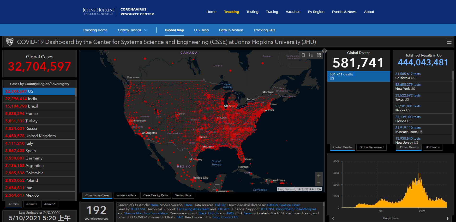 (觀察者網訊)根據美國約翰斯·霍普金斯大學統計數據,截至北京時間2021年5月10日5時20分,美國新冠肺炎累計確診病例32704597例,累計死亡病例581741例。在過去約24小時裏,美國新增確診病例23188例,新增死亡病例243例。