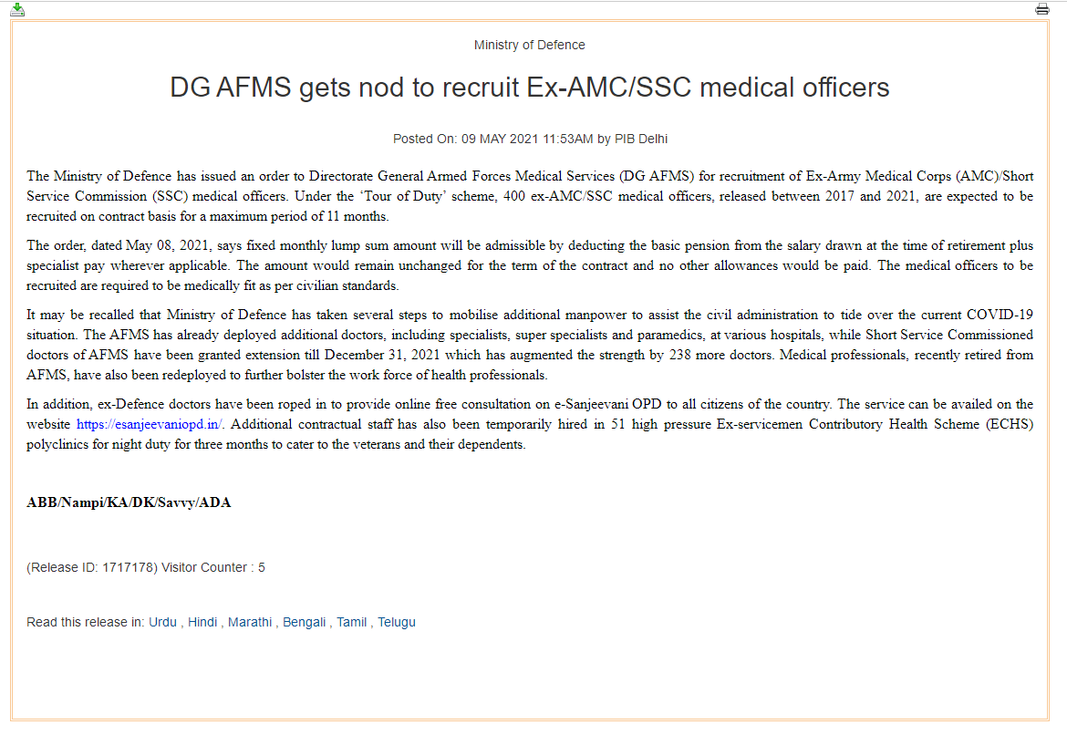 根據通報,近期,印度國防部已採取多項措施來協助抗擊疫情,軍方在各家醫院部署了額外的醫療專家及醫護人員,接受印度武裝部隊醫務處(Armed Forces Medical Services)短期服務委託的醫生的服務期限被批准延長至2021年12月31日,相關醫生人數也增加了238名。此外,還有一些退役軍醫參與為全國範圍內的印度公民提供線上診療服務。