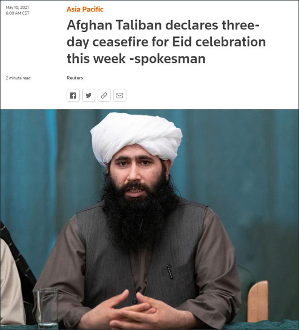 (觀察者網訊)據路透社(Reuters)報道,阿富汗塔利班發言人穆罕默德·納伊姆(Mohammad Naeem)週一(10日)宣佈,將在開齋節(Eid)期間在阿富汗全境停火三天。